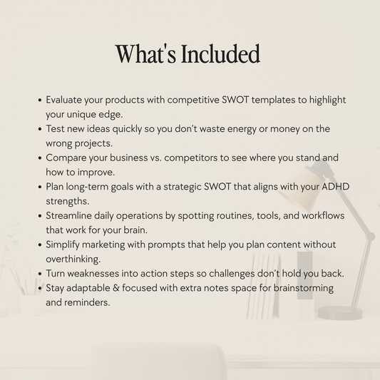 Achieve your business goals with ADHD-friendly templates. Customizable resources for neurodivergent entrepreneurs to thrive effortlessly
